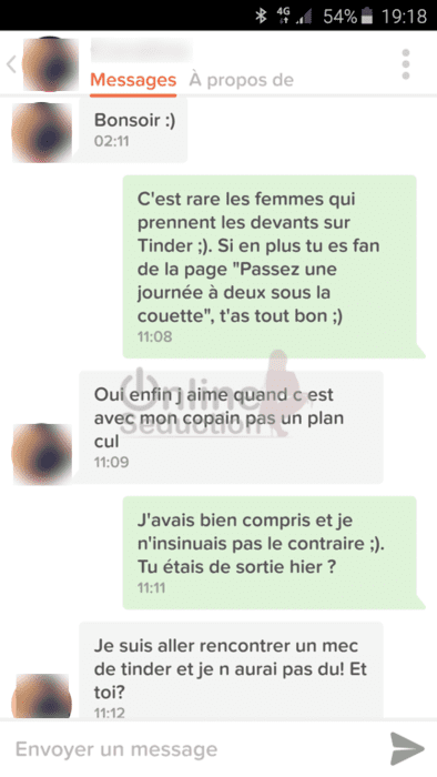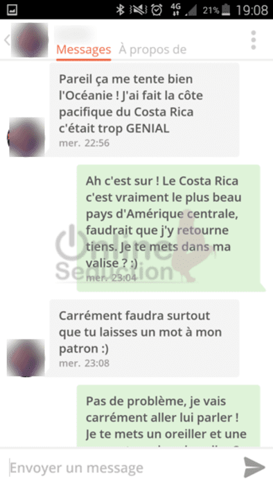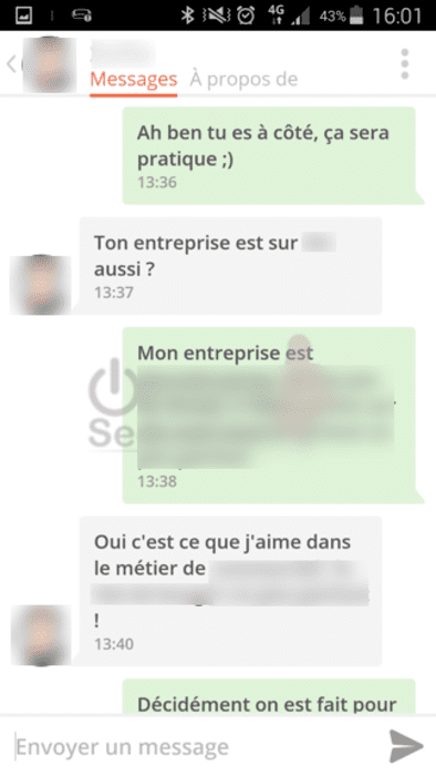 Quatre jours plus tard, elle me répond enfin en me disant que ce n’est pas pratique de parler ici. Elle répond à ma question sur son job qui avait pour but d’augmenter un peu le confort et de démontrer des hautes valeurs en parlant du mien (puisqu’elle allait forcément me retourner la question). Du coup je prends également mon temps pour lui répondre (deux jours), pas bien le choix, je ne peux pas lui montrer que je suis pendu à Tinder à attendre sa réponse alors qu’elle met plusieurs jours pour répondre aux miens. Bref, j’enchaine sur mon boulot pour me dhv un petit peu… Et là…