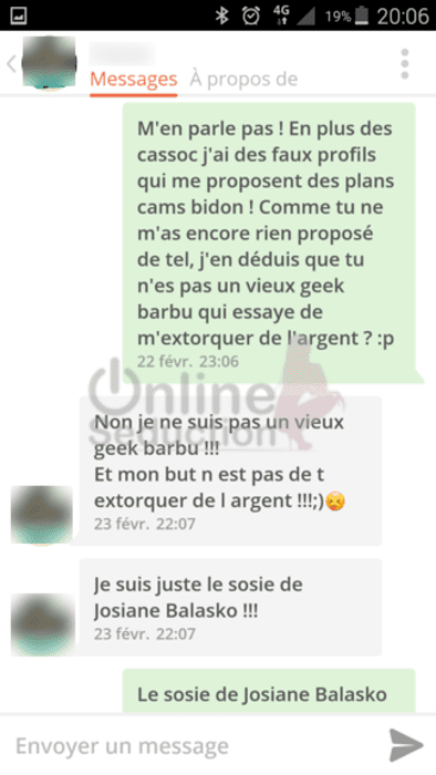 Elle accroche et rentre dans mon jeu rapidement. Du coup, je lui glisse indirectement et de manière fun que l’on va se rencontrer afin de préparer le terrain. Elle s’investit de plus en plus dans l’échange avec des réponses longues, ça commence à sentir bon. Je lui lance ma routine du vieux geek barbu, ça passe comme sur des roulettes, elle surenchérit en m’affirmant être le sosie de Josiane Balasko. Bref, elle s’amuse et moi aussi, jusqu’au moment ou patatra…