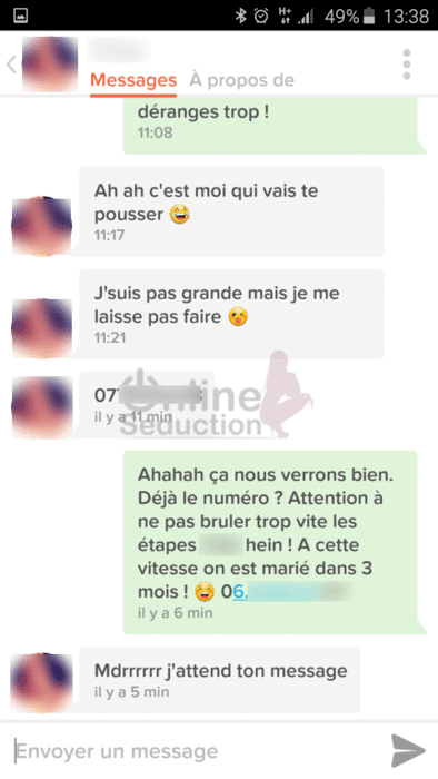 Je me dis que je ne vais jamais y arriver et tente alors de passer en mode tchat en lui répondant quasi immédiatement. On échange encore un ou deux messages « en live » et je tente le numclose pendant qu’elle est encore connectée. Je lui glisse une petite line fun pour la rassurer sur mes intentions, Bingo !