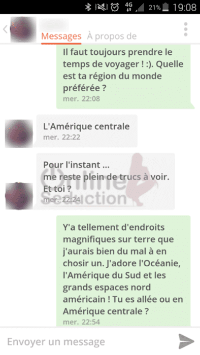 Même moi je décroche, puisqu’à un moment je lui redemande d’ou elle vient alors que je le lui avais déjà demandé quelques messages plus haut. Heureusement, je me rattrape avec une petite ruse de sioux.
