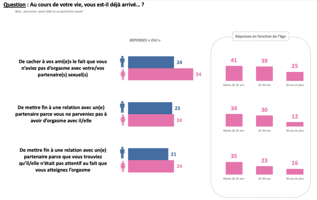 Atteindre un orgasme peut être compliqué pour certaines ou certains. Les femmes sont 78 % à avouer avoir déjà eu des difficultés à atteindre un orgasme avec un partenaire au cours de leur vie et les hommes sont quant à eux 57 % à reconnaître avoir déjà eu des difficultés à atteindre un orgasme. Les femmes de moins de 30 ans sont quant à elles 87 %.